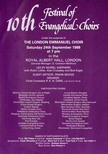 | Choirs | Evangelical Choirs: Bethany Gospel Singers, Isle of Wight, Bethesda Church Choir, Ipswich, Bexhill Symphony Chorus, Cambridge Choir, Zion Baptist, Caversham Gospel Singers, Colne Gospel Singers, Crofton Baptist Choir, Derby Crusade Choir, Folkestone Celebration Choir, Glasgow, Cambuslang Old Parish Church, Guernsey Fellowship Choir, Havering New Life, Hull Evangel, Leicester Evangelical Choir, Liverpool Festival Praise, Living Song, Exeter, Living Waters, Margate, London Emmanuel Choir, Longfleet Baptist, Poole, Lowestoft Christ Church, Moordown Gospel Singers, Bournemouth, Morlandow Singers, Helston, New Horizons Choir, Bromley, Plymouth Central Hall Choir, Rugby Evangelical Singers, Sandy Baptist, South Lincolnshire Gospel, Swindon Evangelical Choir, Teddington Baptist, Winchester, Stanmore Evangelical |