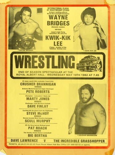 | Set List | Heavyweight - Big Bertha (Big Bill Bromley) v Pat Roach (Birmingham), Heavyweight - Kwik-Kik Lee (Tokyo, Japan) v Wayne Bridges, Light Heavyweight - Marty Jones (Oldham) v Dave Finlay (Belfast, Northern Ireland), Welterweight - Dave Lawrence (Nottingham) v Grasshopper (Phil Johnson), Heavyweight - Crusher Brannigan (New York, USA) v Pete Roberts (Chatham, Kent), Heavyweight - Lennie Hurst (Montego Bay) v Scull Murphy (Plymouth, Devon) |