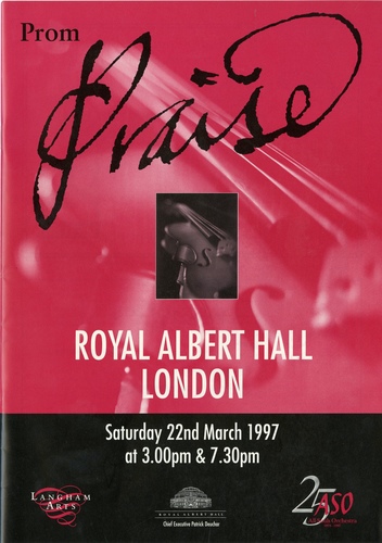 | Choirs | Prom Praise Massed Choir: All Souls, Langham Place, All Saints, Lindfield, Balham Baptist, Beckenham URC, Beechen Grove Baptist, Bromley Baptist, Bushey Baptist, Christ Church, Bexley Heath, Christ Church, Old Kent Road, Christ Church, Orpington, Enfield Baptist, Frimley Baptist, Frinton Free, Gunnersbury Baptist, Hitchen Church of God, Harefield, Harlow, Holy Trinity, Claygate, Holy Trinity, Hatfield Heath, Honor Oak Christian Fellowship, Hook Evangelical Church, Surbiton, Kenton Baptist, Milton Keynes Chorale, Music in Worship Foundation, Oxford, Newport Pagnell URC, Nork Community, Oakwood Chapel & St Mary's, Harlow, Rye Lane Chapel, St. Barnabas, Kensington, St. Barnabas, Linslade, St. James', Woodley, St. John's, Welling, St. Luke's, West Norwood, St. Mary's, Osterley, St. Mary's, Sheering, St. Michael and All Angels, Hatfield, St. Nicholas, Sevenoaks, St. Paul's, Finchley, St. Peter's, St. Helier Morden, West Road, Bury St. Edmunds, Wormley Free Church |