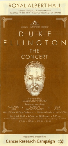 | Set List | 'East St. Louis Toodle-OO', Duke Ellington-Bubber Miley, 'Carolina Shout', James P Johnson, 'Soda-Fountain Rag', Duke Ellington, 'If You Can't Hold the Man You Love', Kahal-Fain, 'Jig Walk', Duke Ellington, 'Creole Love-Call', Duke Ellington, 'Jungle Nights in Harlem', Duke Ellington - Irving Mills, 'Black and Tan Fantasy', Duke Ellington - Bubber Miley, 'Solitude', Duke Ellington - Eddie De Lange - Irving Mills, 'Merry-Go-Round', Duke Ellington, 'Rocking in Rhythm', Duke Ellington - Harry Carney - Irving Mills, 'Mood Indigo', Duke Ellington - Albany Bigard - Irving Mills, 'Black Beauty', Duke Ellington, 'Sophisticated Lady', Duke Ellington - Mitchell Parish - Irving Mills, 'Prelude to a Kiss', Duke Ellington - Irving Gordon - Irving Mills, 'Reminiscing in Tempo', Duke Ellington - Mel Torme, Medley: 'Perdido', Juan Tizol - Harry Lenk - Ervin Drake, 'Caravan', Duke Ellington - Juan Tizol - Irving Mills, 'I Let a Song Go Out of My Heart', Duke Ellington - Henry Nemo - Irving Mills, 'Do Nothing Till You Hear From Me', Duke Ellington - Bob Russell, It Don't Mean a Thing', Duke Ellington - Irving Mills INTERVAL 'Take the 'A' Train', Billy Strayhorn, 'Lush Life', Billy Strayhorn, 'Cotton Trail', Duke Ellington, 'Pitter Panther Patter', Duke Ellington, 'I Got it Bad', Duke Ellington - Paul Webster, 'In a Sentimental Mood', Duke Ellington - Manny Kurtz - Irving Mills, 'Warm Valley', Duke Ellington - Bob Russell, 'I'm Beginning to See the Light', Duke Ellington - Don George - Johnny Hodges - Harry James, 'Just Squeeze Me', Duke Ellington - Lee Gaines, 'Sonnet for Sister Kate', Duke Ellington - Billy Strayhorn, 'Moonbow', Duke Ellington, 'Satin Doll', Duke Ellington - Billy Strayhorn - Johnny Mercer, 'Come Sunday', Duke Ellington, 'Harlem Airshaft', Duke Ellington, Medley: 'Azure', Duke Ellington - Irving Mills, 'Don't Get Around Much Anymore', Duke Ellington - Bob Russell, 'I Ain't Got Nothing But the Blues', Duke Ellington - Don George, 'C-Jam Blues', Duke Ellington, 'Lotus Blossom', Billy Strayhorn |