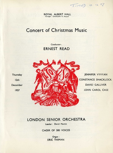 | Set List | 'Fanfare For Christmas Day', Martin Shaw (Choir of 500 Voices), 'O Come All Ye Faithful' (Choir of 500 Voices), 'Christmas Music' from Messiah, Handel (Jennifer Vyvyan, Constance Shacklock, David Galliver, John Carol Case, Choir of 500 Voices), 'Unto Us is Born a Son' (Choir of 500 Voices), 'Angels From The Realms of Glory' (Choir of 500 Voices), 'In Terra Pax', Finzi (Jennifer Vyvyan, John Carol Case, Choir of 500 Voices), 'Good King Wenceslas' (Choir of 500 Voices), 'In Bethlehem City', arr. Vaughan Williams (Choir of 500 Voices), 'King Jesus Hath A Garden' (Choir of 500 Voices), 'God Bless The Master', arr. Vaughan Williams (Choir of 500 Voices), 'The First Nowell' (Choir of 500 Voices), 'The Twelve Days of Christmas', arr. Eric Thiman (Choir of 500 Voices), 'Ring Out, Wild Bells', Percy Fletcher (Choir of 500 Voices) |