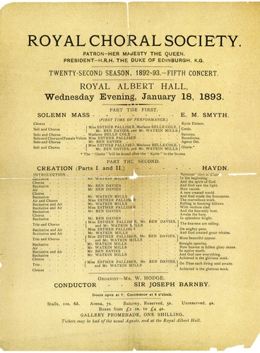 Performance TitleRoyal Choral Society (Twenty-Second Season 1892-1893) - Fifth Concert - Smyth's 'Solemn Mass in D' and Haydn's 'Creation'