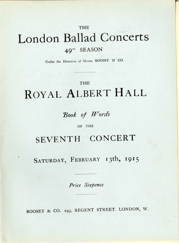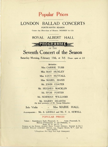 | Secondary Performers | S Liddle, F A Sewell - accompanists |