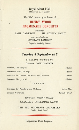 | Set List | Prelude, 'The Tempest', Sibelius, Symphonic Poem, 'En Saga', Sibelius, 'Violin Concerto in D Minor', Sibelius (Henry Holst), 'Symphony No.7 in C', Sibelius, 'Piano Concerto', Arthur Bliss (Shulamith Shafir), 'Trumpet Voluntary', Purcell-Wood (Ernest Hall, Berkeley Mason) |