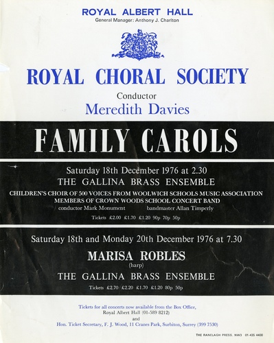 | Set List | 'God Save the Queen' (The National Anthem), arr. Elgar, 'Once in Royal David's City', H J Gauntlett, arr. A H Mann, Willcocks, 'The Boar's Head Carol', arr. Sargent, 'Sans Day Carol', arr. Rutter, 'Ding Dong! Merrily on High', arr. Francis Jackson, 'I Saw Three Ships', trad., 'The First Nowell', arr. Willcocks, 'Mary Had A Baby', arr. Bruce Cole, 'God Rest You Merry', Gentlemen, trad. INTERVAL 'Good King Wenceslas', arr. Reginald Jacques, 'The Holly and the Ivy', trad., 'Away in a Manger', arr. Reginald Jacques, 'The Great Songs of Christmas', arr. Robert Lowden (Crown Woods School Concert Band, Bandmaster Allan Timperley), 'Shepherd's Pipe Carol', John Rutter, 'Hark! The Herald Angels Sing', Mendelssohn, arr. Willcocks |