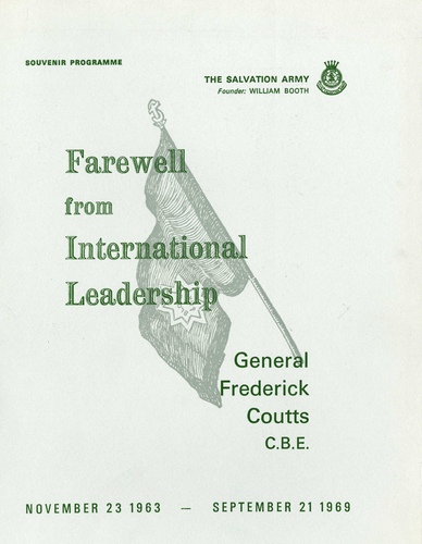 | Main Performers | Commissioner Erik Wickberg, Mrs Commissioner Wickberg, General Frederick Coutts, Mrs Commissioner Fairbank, Cadets of the International (William Booth Memorial) Training College, Commissioner A E Mingay, Commissioner Emma Davies, Arthur Coxhead, Students of the Senior National School of Music |