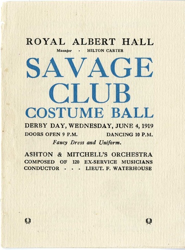 "Savage Club Rall [sic] - 'Wild Men and Women' At the Albert Hall Savages vary in their choice of food, but tradition has it that one and all enjoy the dance. At last night's gathering at the Albert Hall the wild wild men and the wild wild women, while they perhaps shared an antipathy for missionaries and, in some cases wore trifle more in the nature of covering than, say, the cannibals whom we are presently to see on the film, certainly enjoyed wild wild dances. The lights did not go up until nearly 10 o'clock, and then the floor which had been deserted filled up quickly, the seats on the green-centre tiers being a popular view-point. The early squaws and their attendant savages had plenty of room for dancing and for admiring the original decorations, which were worth careful scrutiny. There were Joseph Harker's savage scenic side pieces with a suggestion of civilized wild people at the North Pole. There were totem signs around the hall linking the tiers of boxes in which prehistoric G. B. Shaws and George Robeys could be recognized. The chief totems were by Mr Edwin Morrow, but Mr E. L. Stampa and Mr Studdy were responsible for many others. The most popular rendezvous signs were three balls for 'uncle' and a 'fig leaf' for early drapery, but there were many others. The programme was by Barribal and proved sufficiently puzzling. There were many others besides Savages at the ball. There was a lady entirely masked her face and a man who favoured the Ptolemy period. Indian braves were the most attractive figures, and members of the club acting as stewards chose this make-up, sacrificing their comfort to claborate [sic] grease paint. High plumes waved on many heads, but the prettiest coiffure of all was that of a slim girl in a fluffy red wig and black and white Pierrot costume. A couple representing stained glass figures were perhaps the most original. Princess Marie Louise and Princess Victoria and Lord Carisbrooke came in before 11. They were of Sir Herbet Morgan's party, and Sir Frederick Sykes and Mr Knoblock were also with them. The stage was largely represented by after-theatre parties, and so were the sister arts. Probably because it was Derby night parties were later than usual. The winner of the Derby was a much congratulated figure; there were others who deserved condolences, but got none. Mr Hawker came late with a merry party." (The Times, 5 June 1919) |