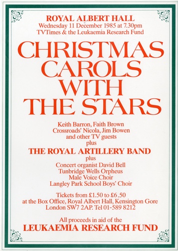 | Set List | 'A Christmas Festival Overture', Anderson (The Royal Artillery Band, David Bell), TV Times Carol Number 6 - 'O Come, All Ye Faithful' (Everyone), 'Kwmbayah', arr. K J Dinham (Royal Tunbridge Wells Orpheus Male Voice Choir), 'Four Traditional Carols', arr. Lewis (Langley Park Boys' Choir), TV Times Carol Number 5 -- 'Away in A Manger' (Everyone), 'Train Ride for a Winter Holiday', Prokofiev (The Royal Artillery Band), TV Times Carol Number 4 - 'One in Royal David's City' (Everyone) INTERVAL 'Midnight Sleighride', arr. Payne (The Royal Artillery Band), 'Somerset Carol', arr. Llewellyn, Lewis (Langley Park Boys' Choir), TV Times Carol Number 3 - 'Hark! The Herald Angels Sing' (Everyone), 'Deck the Hall', arr. Stevens, (Royal Tunbridge Wells Orpheus Male Voice Choir), 'White Christmas', Berlin, arr. Lewis (Langley Park Boys' Choir), 'Dance of the Tumblers', Rimsky-Korsakov (The Royal Artillery Band), TV Times Carol Number 2 'While Shephereds Watched' (Everyone), TV Times Carol Number 1 'See Amid the Winter's Snow' (Everyone) |