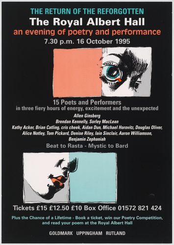 | Set List | Brian Catling, Aaron Williamson, Aidan Dunn, Denise Riley, Iain Sinclair, Cris Cheek, Michael Horovitz INTERVAL Benjamin Zephaniah, Douglas Oliver, Alice Notley, Brendan Kennelly, Sorley MacLean, Tom Pickard, Anne Waldman, 'The Ballad of the Skeletons' (Allen Ginsberg with Paul McCartney) |