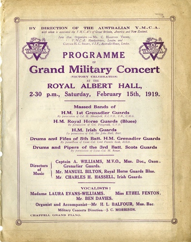 | Set List | 'National Airs of our Allies and Dominions' (Drums and Fifes of the Grenadier Guards and the Pipers of the Scots Guards), Hymn: 'For All The Saints' (Massed Bands and Grand Organ), Overture in C 'In Memorium', Sullivan (Massed Bands and Grand Organ), Aria:'I Know That My Redeemer Liveth', Handel (Laura Evans-Williams), Recitation: 'Comfort Ye' from Messiah, Handel (Ben Davies), Air: 'Every Valley' from Messiah, Handel (Ben Davies), 'Hallelujah Chorus' from Messiah, Handel (Massed Bands and Grand Organ), 'Last Post' from Messiah, Handel (Bugles and Drums of H.M. Grenadier Guards), Nautical Overture: 'Plymouth Hoe', Ansell (Massed Bands), 'Land of Hope and Glory', Elgar (Ethel Fenton), 'My Dreams', Tosti (Ben Davies), Cornet Solo: 'The Lost Chord', Sullivan (Corporal Warnell), Fantasia on Popular Songs and Choruses: 'Empireland' (Massed Bands), Pot Pourri: 'Melodious Memories', Finck (Massed Bands), Duet: 'Ye Banks and Braes', Finck (Laura Evans-Williams, Ethel Fenton), Humoresque: 'Has Anybody Here Seen Kelly?', Bellstadt (Massed Bands), Grand Military Fantasia: 'British Army Quadrilles', Julien (Massed Bands, Pipers of Scots Guards) |