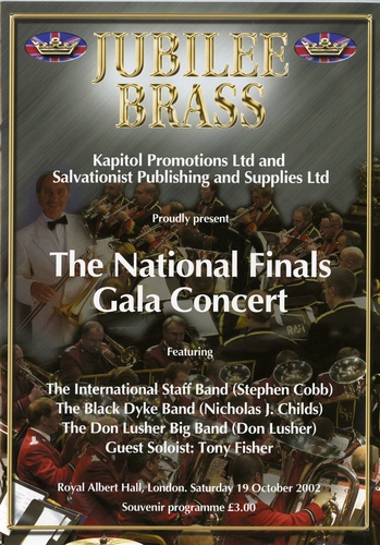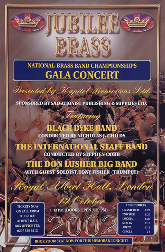 | Set List | 'Flourish and Dances', Kevin Norbury (The International Staff Band), 'Music for a Joyful Occasion', Kenneth Downie (The International Staff Band), 'Dear Lord and Father', Parry, arr. Peter Graham (The International Staff Band), 'The Last Anon', Peter Graham (The International Staff Band), 'Summon the Dragon', Peter Graham (Black Dyke Band), 'Mexican Hat Dance', Rafel Mendez, arr. Webster (Roger Webster, Black Dyke Band), 'Cossack Fire Dance', Peter Graham (Black Dyke Band), 'The Finale from Symphony No.3', Saint-Saens, arr. Cousins (Black Dyke Band) INTERVAL 'DL Blues', (The Don Lusher Big Band), 'Love for Sale', Cole Porter, arr. Myers (The Don Lusher Big Band), 'Dreamsville', Henry Mancini (The Don Lusher Big Band), 'Close Enough for Love', Johnny Mandel, arr. Roland Shaw (Tony Fisher, The Don Lusher Big Band), 'Sesame Street', arr. Denis di Blasio (Tony Fisher, The Don Lusher Big Band), 'Frankie and Johnny' traditional, arr. Don Lusher (The Don Lusher Big Band), 'Mr. Anthony's Boogie', Ray Anthony (The Don Lusher Big Band), 'Bravura Variations on British Folk Songs', arr. Peter Graham (David Childs, Derick Kane, Steven Mead, David Thornton, Massed Bands, Black Dyke Band, The International Staff Band) '1812 Overture, Op.49', Tchaikovsky, arr. Wright (Massed Bands, Black Dyke Band, The International Staff Band ) |
