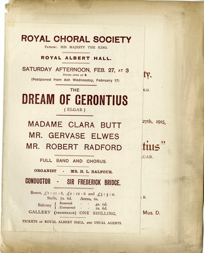 | Main Performers | Clara Butt, Gervase Elwes, Robert Radford - vocals, H L Balfour - organ |