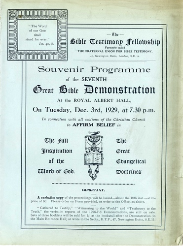 | Main Performers | Rev. J A G Ainley, Rev. A W Payne, Rt. Hon. Viscount Brentford (Joynson-Hicks), A Lindsay Glegg, Rev. Russell Howden, Rev. E A Carter, Rev. John McNeill - speakers, Jacques Hopkins - vocal, Allan Brown - organ |