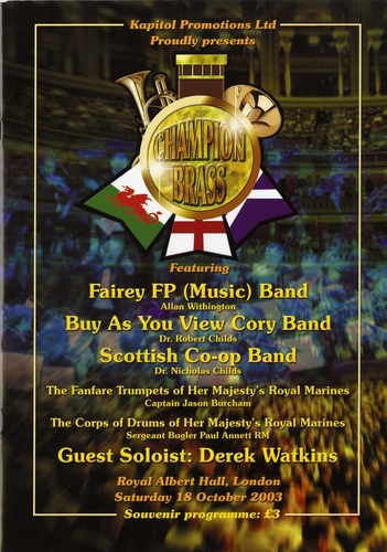 Buy As You View Cory Band: 'Softly Softly', Briget Fry, arr. Ray Farr, 'Georgia on My Mind', Hoagy Carmichael, Stuart Gorrell, arr. Goff Richards (Christopher Thomas), 'Hora Staccato', Grigoras Dinicu, arr. Goff Richards, 'Napoli', Herman Bellstedt, arr. Dr. Robert Childs (David Childs), 'Finale from Symphony No.4', Tchaikovsky, arr. Derek Ashmore INTERVAL Massed Band - Fairey FP (Music) Band, Buy As You View Cory Band, Scottish Co-op Band with The Fanfare Trumpets of HM Royal Marines, The Corps of Drums of HM Royal Marines: 'Fanfare' (The Fanfare Trumpets of HM Royal Marines), 'Introduction, Act III' from Lohengrin, Wagner, arr. Denis Wrightilds, 'Mac Arthur Park', James Layne Webb, arr. Stephen Rockey, 'Colonel Bogey', Kenneth Alford, 'Finlandia, Op.26', Sibelius |