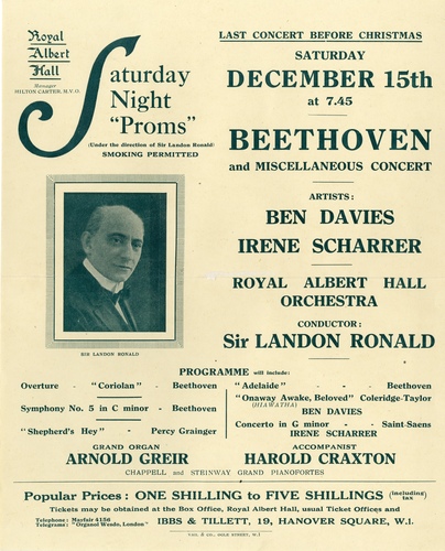 | Set List | Recital on Grand Organ (Arnold Greir): 'Sonata in G, Op.28' (1st Movement), Elgar, 'Andante in D', Hollins, 'Scherzo in C Minor' (from 5th Sonata), Guilmant, Overture: 'Coriolan', Beethoven (Royal Albert Hall Orchestra), Song: 'Adelaida', Beethoven (Ben Davies), 'Symphony No 5 in C Minor', Beethoven (Royal Albert Hall Orchestra), 'Shepherd's Hey', Percy Grainger (Royal Albert Hall Orchestra), 'Piano Concerto in G Min', Saint-Saens (Irene Scharrer), 'Onaway, Awake, Beloved' from Hiawatha, Coleridge-Taylor (Ben Davies), Competition Item |