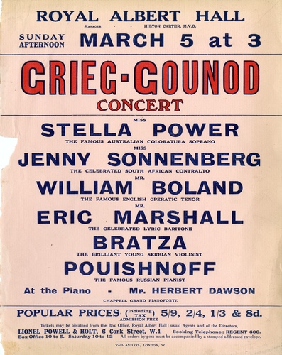 | Set List | 'Sonata in G, Op 13, Grieg, (Pouishnoff and Bratza), Valse Song - 'Romeo et Juliette', Gounod, (Stella Power), Recit and Aria - 'Lend me your Aid' (Reine de Saba), Gounod, (William Boland), Recit et Air - 'O Ma lyre immortelle' (Sapho), Gounod, (Jenny Sonnenberg), Pianforte Soli - 'Homewards', Grieg, (Pouishnoff), 'Lullaby', Grieg, (Pouishnoff), 'Wedding Day at Troldhaugen', Grieg (Pouishnoff), Aria - 'Even Bravest Hearts' (Faust), Gounod, (Eric Marshall), 'Solvejg's Song', Grieg, (Stella Power), 'A Swan', Grieg, (Stella Power), Violin Solo - 'Faust Fantasie', Gounod - Wieniawski, (Bratza), Aria - 'All Hail Thou Dwelling', (Faust), Gounod, (William Boland), Aria - 'Ave Maria', Gounod, (Jenny Sonnenberg), Air - 'Le Vallon' Gounod, (Eric Marshall) |