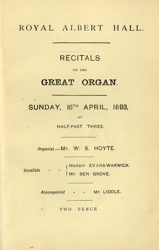 | Main Performers | Madam Evans-Warwick, Mr. Ben Grove - vocals, H S Hoyte - organ |