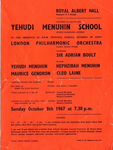 | Set List | 'Largo Ma Non Tanto' (Double Concerto), J S Bach (Yehudi Menuhin, Marcia Crayford, London Philharmonic Orchestra), 'Overture' from Russlan and Ludmilla, Glinka (London Philharmonic Orchestra), 'The Story of Babar The Little Elephant', Poulenc (Cleo Laine, London Philharmonic Orchestra), 'Triple Concerto in C, Op.56', Beethoven (Yehudi Menuhin, Hephzibah Menuhin, Maurice Gendron, London Philharmonic Orchestra) INTERVAL 'Concerto in A Minor for Violin, Cello and Orchestra', Brahms (Yehudi Menuhin, Maurice Gendron, London Philharmonic Orchestra) |