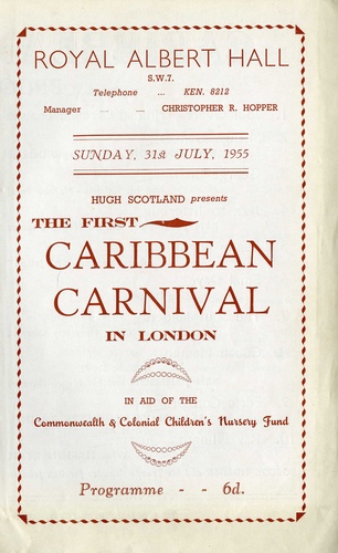 | Performance Notes | Before the annual Notting Hill Carnival was started in London in 1966 had begun, this concert was staged at the Hall and sponsored by Hugh Scotland, a Jamaican entrepreneur. Was this the first Caribbean Carnival as the programme boldly proclaims? It was just a concert, not an outdoor procession on the streets but it boldly offered many of the elements of Trinidadian Carnival with calypso, pan, limbo, bongo, staged stick fighting and featured many of the most important Trinidadian artists in England at the time. As a result, it deserves to be considered as an important precursor to later Carnival celebrations in England.