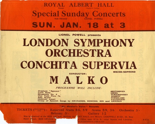 | Set List | 'Overture' 'Egmont', Beethoven (London Symphony Orchestra), 'Se Tu M'Ami', Pergolese (Conchita Supervia, London Symphony Orchestra), 'Occhietti Amati', Falconieri (Conchita Supervia, London Symphony Orchestra), 'Una Voce Poco Fa' from Barbiere, Rossini (Conchita Supervia, London Symphony Orchestra), 'Lyric Suite,Op.54', Grieg (London Symphony Orchestra), 'Canco De Maria', Lamote De Grignon (Conchita Supervia), 'Fandanguillo', Romero (Conchita Supervia), 'El Majo Discreto', Granados (Conchita Supervia), 'Canto Elegiaco', Joaquin Nin (Conchita Supervia), 'Granadina', Joaquin Nin (Conchita Supervia), 'Symphony No.4', Tchaikovsky (London Symphony Orchestra) |