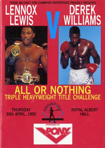 | Set List | Heavyweight - Lennox Lewis (London) v Derek Williams (London), Bantamweight - Johnny Armour (Chatham) v Ndabe Dube (Zimbabwe), Lightweight - Ian Honeywood (Swanley) v Sean Murphy (London), Light-Welterweight - Jason Rowland (East London) v Steve Pollard (Hull), Light-Heavyweight - Hussain Shah (London) v Terry Duffus (Gloucester), Welterweight - Kevin Lueshing (Beckenham) v Newton Barnett (Brixton), Lightweight - Greg Egbuniwe (London) v Carl Tilley (Doncaster), Super-Middleweight - Abel Asinamali (Tooting) v Terry French (Newcastle) |