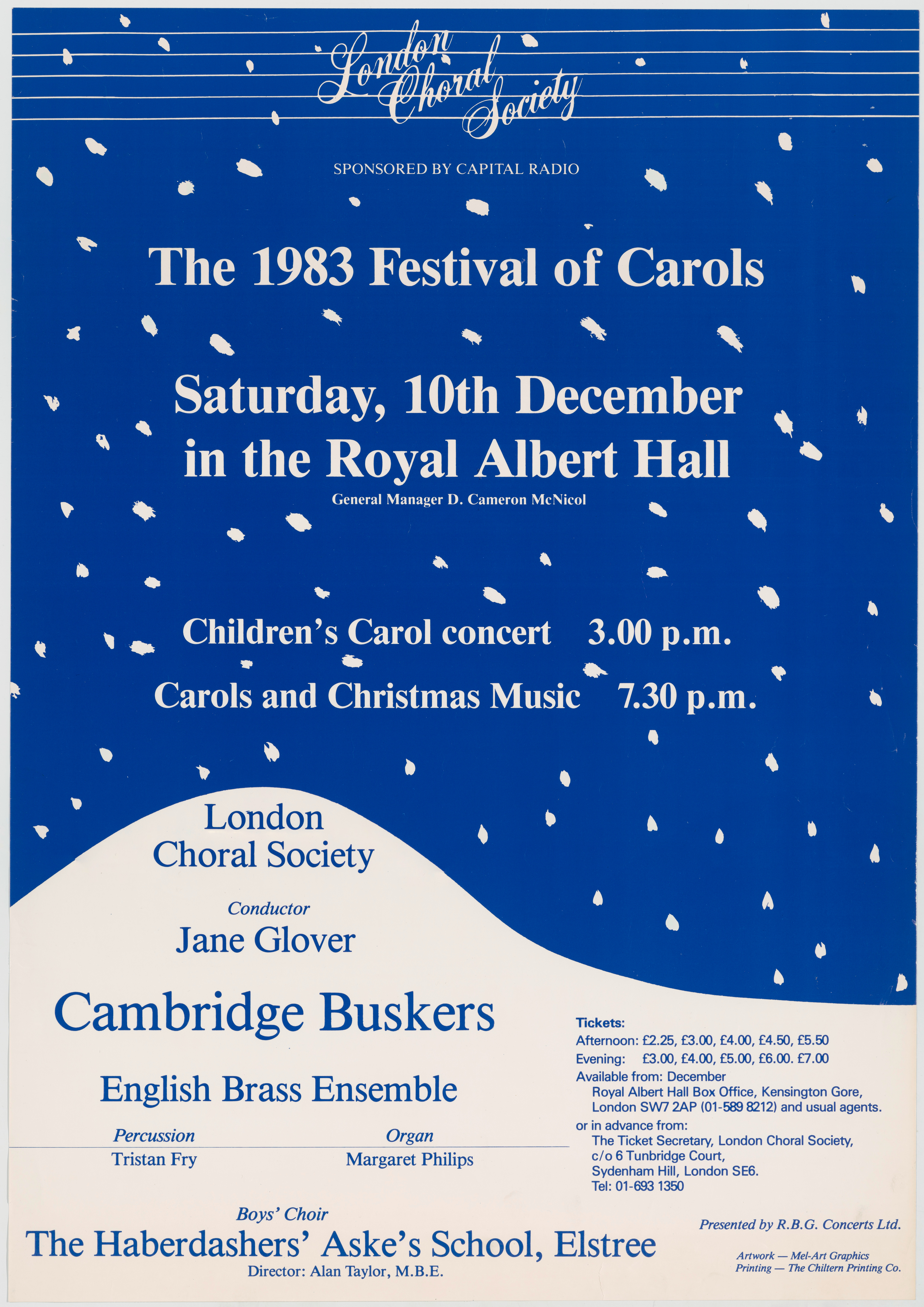 | Set List | 'God Rest You Merry Gentlemen', 'Zither Carol', arr. Sargent 'Es Ist Ein' Ros'', arr. Michael Praetorius, 'Away in a Manger', W K Kirkpatrick, 'Trumpet Voluntary', Jeremiah Clarke, arr. John Iveson (English Brass Ensemble), 'It Came Upon the Midnight Clear', adpt. Sullivan, 'What You Gonna Call Yo' Pretty Little Baby?', arr. Alan Taylor (Haberdashers' Boys' Choir), 'Angel Tidings', arr. Alan Taylor (Haberdashers' Boys' Choir) 'I Saw Three Ships', trad. 'Adam Lay Ybounden', Boris Ord 'In Dulci Jubilo', harm. Bartholomew Gesius, harm. J S Bach 'Hark! The Herald Angels Sing', Mendelssohn, arr. Willcocks INTERVAL' 'Once in Royal David's City', H J Gauntless, arr. A H Mann, 'Shakespeare's Carol', Thomas Arne 'O Little Town of Bethlehem', arr. Vaughan Williams, 'What Cheer? Good Cheer!', Warlock (Haberdashers' Boys' Choir), 'Raggle Taggle Three Wise Men', Herbert Chappell (Haberdashers' Boys' Choir), 'While Shepherds Watched Their Flocks', arr. T Ravenscroft, 'Cambridge Buskers', 'The Three Kings', Peter Cornelius, arr. Ivor Atkins (Richard Jackson), 'The Twelve Days of Christmas', arr. John Rutter, 'O Come All Ye Faithful', arr. D Willcocks |