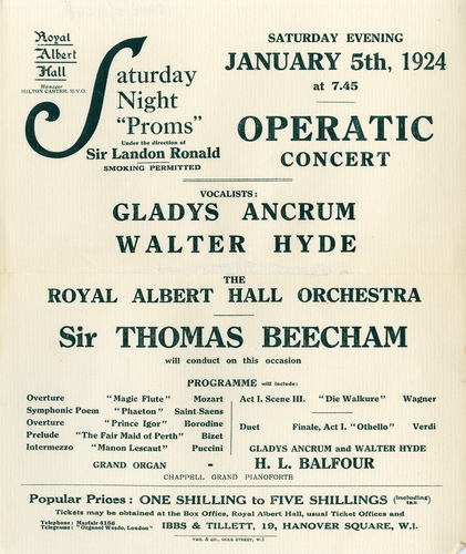 | Set List | Recital on Grand Organ: 1st Movt '6th Symphony', Widor (H L Balfour), 'Minuet Antique', Horace Watling (H L Balfour), 'Concert Rondo', Hollins (H L Balfour), Overture: 'Magic Flute', Mozart (Royal Albert Hall Orchestra), 'Petit Suite', Debussy (Royal Albert Hall Orchestra), Duet: 'Act 1, Scene 3' from Die Walkure, Wagner (Gladys Ancrum, Walter Hyde),= 'Overture' from Prince Igor, Borodin (Royal Albert Hall Orchestra), Prelude: 'The Fair Maid of Perth', Bizet(Royal Albert Hall Orchestra), Duet: 'Finale Act 1' from Othello, Verdi (Gladys Ancrum, Walter Hyde), Intermezzo: 'Manon Lescaut', Puccini (Royal Albert Hall Orchestra), Competition Item |