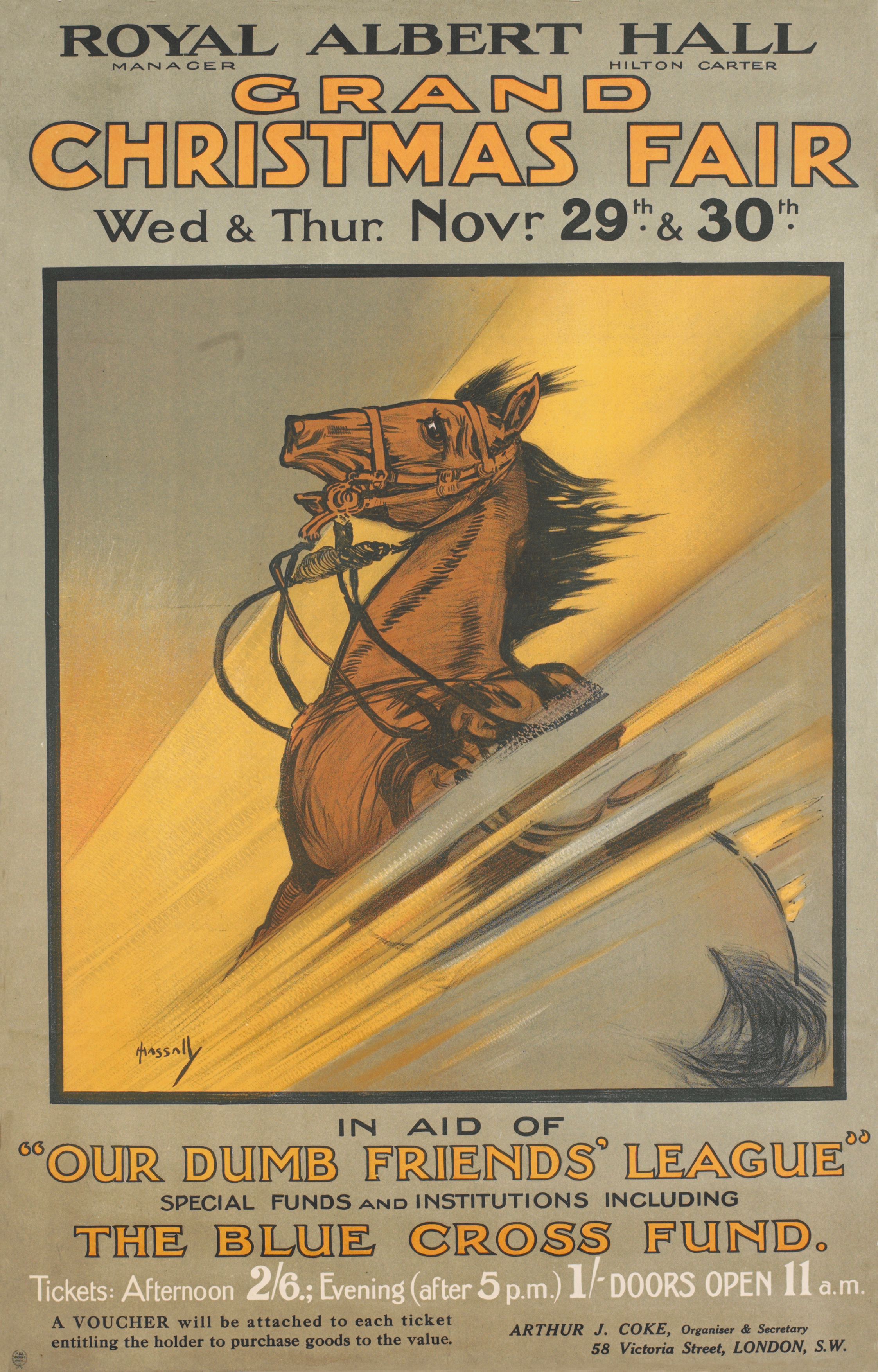 "Princess Arthur of Connaught opened at the Albert Hall yesterday a bazaar and Christmas Fair organised by Our Dumb Friend's League. She was received by Lord Lonsdale and the members of the executive committee. A bouquet was presented to the Princess by Lady Smith-Dorrien's little son, and Mme Ada Crossley sang the National Anthem. Princess Arthur afterwards went round the stalls. Girl Guides formed an escort. A special feature of the fair is the exhibition of historical costumes, antique dolls, and toys, comprised in the collection of Miss Clara Millard." (The Times, 30 November 1916)