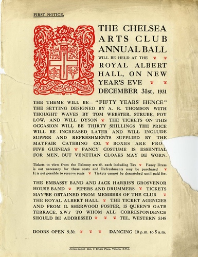 Founded in 1891 The Chelsea Arts Club is a members club for artists, which for 50 years from 1908 held an annual costumed New Year's Eve ball, which was an infamous part of London's social calendar. After two years at the Royal Opera House the extravagant ball proved so popular it moved to the Royal Albert Hall where it stayed until 1958. The balls attracted media attention with their lavish theatrical sets, multiple orchestras, raucous midnight carnivals and balloon drops and crowds of up to 10,000 socialites, bohemian artists, actors, and ordinary Londoners in elaborate and often scandalous fancy dress dancing until 5am.