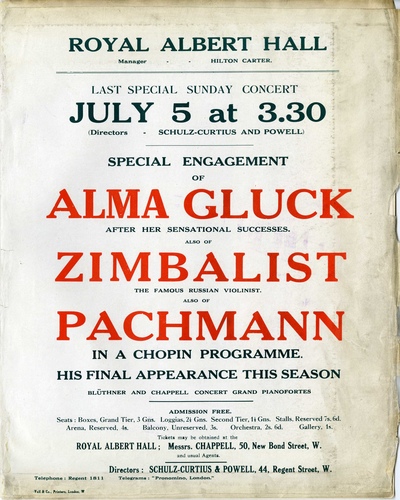 | Set List | Violin Soli: 'Aria', Bach (Zimbalist), 'German Dance', Mozart (Zimbalist), 'Larghetto', Handel (Zimbalist), 'Gavotte', Gossek (Zimbalist), Aria: 'Bird Song' (Pagliacci), Leoncavallo (Alma Gluck), Violin Soli: 'Orientale', Cui (Zimbalist), 'Hebrew Melody and Dance', Zimbalist (Zimbalist), 'Hexentanz', Paganini (Zimbalist), Songs: 'O Tell Me, Nightingale', Liza Lehmann (Alma Gluck), 'Chanson Indoue', Rimsky-Korsakoff (Alma Gluck), 'Mavourneen', Lang (Alma Gluck), 'A June Morning', Willeby (Alma Gluck), Songs (with Violin Obbligato): 'Angel's Serenade', Braga (Alma Gluck, Zimbalist), 'Swance River' (by request), arr. by Zimbalist (Alma Gluck, Zimbalist), Pianoforte Soli: 'Nocturne, Op.55, No.1, in F minor', Chopin (Pachmann), 'Prelude, Op.28, No.23, in F' (Pachmann), 'Prelude, Op.28, No.24, in D minor' (Pachmann), 'Mazurka, Op.17, No.1, in Bb',(Pachmann), 'Third Ballad, Op.47, in Ab' (Pachmann) |