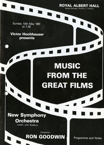 | Set List | 'The Magnificent Seven', Elmer Bernstein (New Symphony Orchestra), 'Carousel Waltz', Richard Rodgers (New Symphony Orchestra), 'Some Enchanted Evening' (South Pacific), Richard Rodgers (New Symphony Orchestra), 'Oklahoma', Richard Rodgers (New Symphony Orchestra), 'Exodus', Ernest Gold (New Symphony Orchestra), 'Raindrops Keep Falling on my Head' (Butch Cassidy & the Sundance Kid), Bacharach, (New Symphony Orchestra), 'Where Eagles Dare', Ron Goodwin (New Symphony Orchestra), 'Limelight', Chaplin (New Symphony Orchestra), 'The Dambuster's March', Coates (New Symphony Orchestra), 'Selection 'Those Magnificent Men in Their Flying Machines', Ron Goodwin (New Symphony Orchestra) INTERVAL 'Aces High' from The Battle of Britain, Ron Goodwin (New Symphony Orchestra), 'Selection from 'Fiddler on the Roof'', Jerry Bock (New Symphony Orchestra), 'Laura', David Raksin (New Symphony Orchestra), 'The Big Country', Jerome Moross (New Symphony Orchestra), 'Scarborough Fair' from The Graduate, trad. (New Symphony Orchestra), 'Zorba's Dance' from Zorba the Greek, Mikis Theodorakis (New Symphony Orchestra), '633 Squadron', Ron Goodwin (New Symphony Orchestra 'The Baby Elephant Walk' (Hatari), Henry Mancini (New Symphony Orchestra), 'Days of Wine and Roses', Henry Mancini (New Symphony Orchestra), 'Charade', Henry Mancini (New Symphony Orchestra), 'Moon River' from Breakfast at Tiffany's, Henry Mancini (New Symphony Orchestra) |