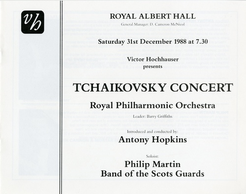 | Set List | 'Sleeping Beauty Waltz', Tchaikovsky (Royal Philharmonic Orchestra), 'Swan Lake Suite', Tchaikovsky (Royal Philharmonic Orchestra), 'iano Concerto No.1 in B Flat Minor, Op.23', Tchaikovsky (Philip Martin, Royal Philharmonic Orchestra) INTERVAL 'Marche Militaire', Tchaikovsky (Royal Philharmonic Orchestra), 'Nutcracker Suite', Tchaikovsky (Royal Philharmonic Orchestra), '1812 Overture, Op.49', Tchaikovsky (Band of the Scots Guards, Royal Philharmonic Orchestra) |