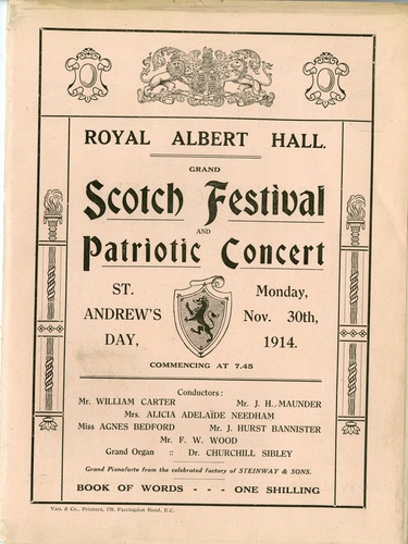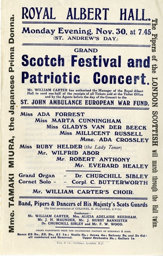 | Set List | March through the Hall (Pipers), National Anthems: England, Japan, Belgium, Russia, France (Combined Choir, Band of HM Scots Guards), Songs: 'Ae Fond Kiss' (Wilfred Abor), 'Mary of Argyll', (Wilfred Abor), Song: 'Charlie Is My Darling', arr. Dr Sibley (Band of HM Scots Guards, Gladys Van der Beeck), Song: 'The Bluebells of Scotland' (Ada Crossley), Song: 'Wi' a Hundred Pipers' (Everard Healy), Part Song: 'The Cambells Are Coming' (William Carter's Choir), Song: 'Angus Macdonald', Roeckel (Ada Forrest), Cornet Solo: 'Jessie the Flower of Dunblane', trad. (C Butterworth), Japanese Song: 'Sakura', Gounod (Tamaki Miura), 'Ave Marie', Gounod (Tamaki Miura), Solo and Chorus: 'The Call of the Motherland', Churchill Sibley (Ruby Helder, William Carter's Choir, Band of HM Scots Guards), Song: 'Annie Laurie' (Robert Anthony), Chorus: 'Ready, Ay, Ready', Alicia Adelaide Needham (William Carter's Choir), Scotch Song: 'Ye Banks and Braes' (Millicent Russell), Chorus: 'Boy Scouts' Patrol', Henrietta Murkens (Band of HM Scots Guards, Chorus by Boy Scouts, William Carter's Choir), Patriotic Chorus: 'Scotland, Bonnie Scotland', Churchill Sibley (William Carter's Choir, Band of HM Scots Guards) INTERVAL March through the Hall (Pipers), Selection: 'Scottish Melodies' (Band of HM Scots Guards), Chorus: 'The Border Ballad', J H Maunder (William Carter's Choir, J H Maunder) Song: 'Comin' Thro the Rye' (Millicent Russell), Ballad: 'Mary', Richardson (Wilfred Abor), Songs: 'Robin Adair', arr. Alfred Moffat (Gladys Van der Beeck), 'Caller Herrin', arr. Alfred Moffat (Gladys Van der Beeck), Song, 'Braw, Braw Lads' (Ada Crossley), Scotch Song: 'Within a Mile' (Tamaki Miura), Song: 'Draw the Sword, Scotland' (Everard Healy), Song: 'MacGregor's Gathering', Keeves (Ruby Helder), Song: 'Afton Water', Burns (Ada Forrest), Scotch Song: 'My Ain Dear Donal' (Millicent Russell), Song: 'Scots War Hae', Lays of Stratherne (Robert Anthony), Chorus: 'Auld Land Syne', arr. William Carter (William Carter's Choir, Band of HM Scots Guards, Dr Churchill Sibley) |