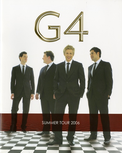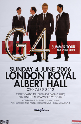 G4: 'You're the Voice', J Farnham, 'Yellow', Coldplay, 'Beautiful', C Aguilera, '...Baby One More Time', B Spears, Bee Gees Medley - 'Tragedy',' Jive Talkin', 'Night Fever', 'First of May', 'You Should Be Dancing', 'Stayin' Alive', 'Fever', 'The Last Song', 'Circle of Life', E John, 'Nessun Dorma', G Puccini, 'You'll Never Walk Alone', Rodgers and Hammerstein, 'La donna è mobile', G Verdi, 'O sole mio', E di Capua, 'It's Not Unusual', TJones (Matt Stiff solo), 'Your Song', E John (Mike Christie solo), 'Unbelievable', C David (Ben Thapa solo), 'Home', M Bublé (Jonathan Ansell solo), 'In The Arms of An Angel', 'From the Heart', Another Level, 'My Way', C François, 'Barcelona', F Mercury, Montserrat Caballé, 'Bohemian Rhapsody', Queen |