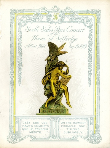 | Main Performers | Mr Harry Gordon Selfridge - speaker, Sam Barton 'nearly rides a bicycle', Du Calion 'on his ladder' - performers, Mlle Tamara Gamsakourdia, Mr Alexandre Demidoff (Principal dancers from Russian Ballet, Moscow) - dancers, Miss Phyllis Lett, Mr John Coates, Miss Rosina Buckman, Mr Charles Coborn - vocals, Mr F Swaine - piano, Mr J A Meale - organ |