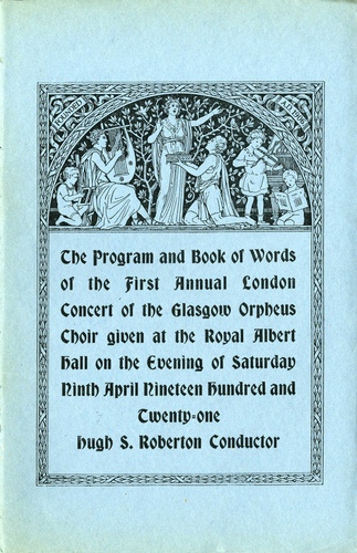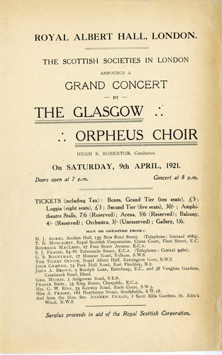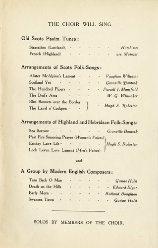| Set List | Organ Recital: 'Reminiscences of Scotland', Godfrey (Arthur Edwards), 'Coronach', Barratt (Arthur Edwards), The Glasgow Orpheus Choir Choral Music: 'Stracathro' (Old Scots Psalm Tune), Hutchison, 'Scotland Yet', Granville Bantock, 'An Eriskay Love Lilt', Hugh S. Robertson, 'Wi' A Hundred Pipers' Purcell J. Mansfield, Solo: 'O Gin I Were a Baron's Heir', Moffat, Solo: 'My Wife Shall Ha'e hHr Will', Francis Geo Scott, 'The Shower', Elgar, Men's Voices: 'It's O To Be A Wild Wind', trad., 'Death On the Hills', trad., 'The Beatitudes', Kalinnikoff, Solo: 'Willie's Rare and Willie's Fair', trad. Old Scots, Solo: 'There's Nae Luck Aboot the House', MacPherson, 'French' (Old Highland Psalm Tune), Mainzer, 'Sea Sorrow', Granville Bantock, 'The Road to the Isles', trad. songs of the Hebrides, 'Blue Bonners Over the Border', Hugh S. Roberton, 'Alister McAlpine's Lament', Vaughan Williams, 'The Deil's Awa', W G Whittaker, Solo: 'Kirkconnel Lea', Helen Hopekirk, Solo: 'Bide Ye Yet', trad. Old Scots, Women's voices: 'Peat Fire Smooring Prayer', Hugh S Roberton, Men's voices: 'The Loch Leven Love Lament', trad., 'The Laird O' Cockpen', trad., Songs of the Hebrides, Solo: 'Altar Isle of the Sea', trad., Solo: 'Churning Lilt', trad., 'As Vesta Was From Latmos Hill Descending', Weelkes, 'Early Morn', Rutland Boughton, 'Turn Back O Man', Gustav Holst |