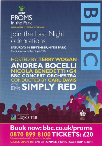 | Set List | 'Portsmouth Point', Walton (BBC Symphony Orchestra), 'Three Arias from Italian Operas', Handel (Andreas Scholl, BBC Symphony Orchestra), 'Concierto de Aranjuez', Rodrigo (John Williams, BBC Symphony Orchestra), 'The Rio Grande', Lambert (Paul Lewis, Karen Cargill, BBC Singers, BBC Symphony Chorus, BBC Symphony Orchestra) INTERVAL 'The Sea Hawk - Main title; Reunion; Finale', Korngold (BBC Symphony Orchestra), 'Scherzi', S Bainbridge (BBC Symphony Orchestra (1st performance at the Proms) 'Down by the Salley Gardens', trad. A Scholl (John Williams), 'King Arthur - 'Fairest Isle', Purcell, arr. P Daniel, J Simpson (Andreas Scholl, John Williams, BBC Singers, BBC Symphony Orchestra), 'Pomp and Circumstance March No.1 in D Major', 'Land of Hope and Glory', Elgar (BBC Singers, BBC Symphony Chorus, BBC Symphony Orchestra), 'Fantasia on British Sea-Songs', Wood, arr. B Chilcott (BBC Singers, BBC Symphony Chorus, BBC Symphony Orchestra), 'Jerusalem', Parry, orch. Elgar (BBC Singers, BBC Symphony Chorus, BBC Symphony Orchestra), 'God Save the Queen' (The National Anthem), arr. Wood (BBC Singers, BBC Symphony Chorus, BBC Symphony Orchestra) |