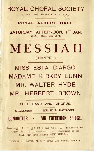 | Main Performers | Miss Esta D'Argo, Madame Kirkby Lunn, Mr Walter Hyde, Mr Herbert Brown - vocals, Mr H L Balfour - organ |