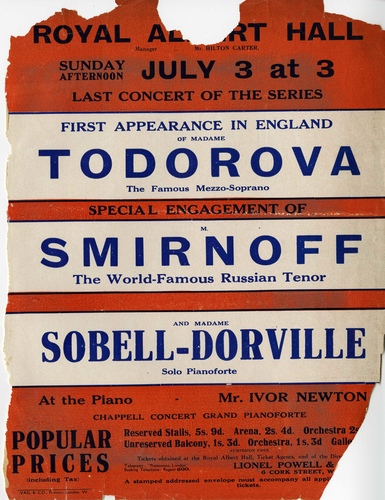 | Set List | Pianoforte Solo - 'Ballade in G minor', Chopin, (Madame Sobell-Dorville), Aria - 'O Don Fatle' (Don Carlos), Verdi, (Madame Todorova), Aria - 'Che Gelida Manina' (La Boheme), Puccini, (M Dimitri Smirnoff), Song - 'Chanson Indoue', (Sadko), Rimsky-Korsakoff, (M Dimitri Smirnoff), Pianoforte Soli - 'Etude de Concert', Liszt, (Madame Sobell-Dorville), 'Minstrels', Debussy, (Madame Sobell-Dorville), 'Seguidillas', Albeniz, (Madame Sobell-Dorville), Three National Slav Songs, arr by Dimitri Khristoff, (Madame Todorova), Songs - 'Oh! Quand je do s', Liszt, (M Dimitri Smirnoff), 'She was ours', Gretchaninoff, (M Dimitri Smirnoff), 'J'ai pleure en reve', Hue, (M Dimitri Smirnoff), Pianoforte Solo - 'Andante Spianato and Polonaise', Chopin, (Madame Sobell-Dorville), |