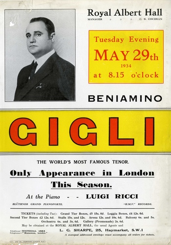 | Set List | 'Improviso' (Andrea Chenier), Giordano (Gigli), 'Tre Giorni Son Che Nina', Pergolesi (Gigli), 'Un Reve', Grieg (Gigli), 'O Bei Nidi D'Amore', Donaudy (Gigli), 'Adieu Mignon, Courage!' (Mignon), Thomas (Gigli), 'Lamento Di Federico' (Arlesiana), Cilea (Gigli), 'Addio Bel Sogno', De Curtis (Gigli, De Curtis), 'Stornelli Marini', Mascagni (Gigli), 'Le Roi D'Ys', Lalo (Gigli), 'Che Gelida Manina' from La Boheme, Puccini (Gigli) |