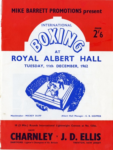 | Set List | Lightweight - Dave Charnley (Dartford) v J D Ellis (Trenton, New Jersey), Lightweight - Vic Andreetti (London) v Frank Garcia (Spain), (Handbill states Tommy Tibbs, Boston, USA) Featherweight - Terry Spinks (West Ham) v Johnny Mantle (Battersea), Light Heavyweight - Bob Nicholson (Farnborough), Lightweight - Tommy Rix (Barking) v Ricky Kiernan (Glasgow), Welterweight - Jimmy McGrail (Liverpool) v Johnny Kramer (West Ham) Lightweight - Peter Cheevers (Streatham) v Joe Falcon (Leicester) (This match appeared on the Handbill) |