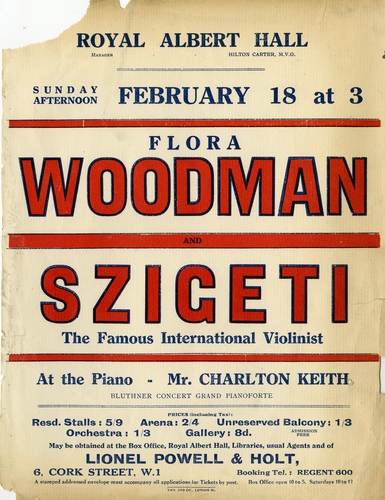 | Set List | Violin Solo - 'La Folia', Corelli, (Szigeti), Aria - 'Una Voce poco fa', (Il Barbiere di Siviglia), Rossini, (Flora Woodman), 'Concerto for Violin in A minor, Op 28, Goldmark, (Szigeti), Songs - 'Bergerette: Jeunes Filletes', Old French, (Flora Woodman), 'Chanson Indoue' (Sadko), Rimsky-Korsakoff, (Flora Woodman), 'La Girometta', Sibella, (Flora Woodman), Violin Soli - 'Sicillienne and Rigaudon', Francoeur-Kreisler, (Szigeti), 'Caprice in E major', Paganini, (Szigeti), 'Danse Slave in E minor', Dvorak-Kreisler, (Szigeti), 'Varaitions', Tartini-Kreisler, (Szigeti), Songs - 'Songs my Mother taught me', Dvorak, (Flora Woodman), 'The Lass with the delicate air', Arne, (Flora Woodman), Violin Solo - 'Scene de la Csarda', Hubay, (Szigeti), |
