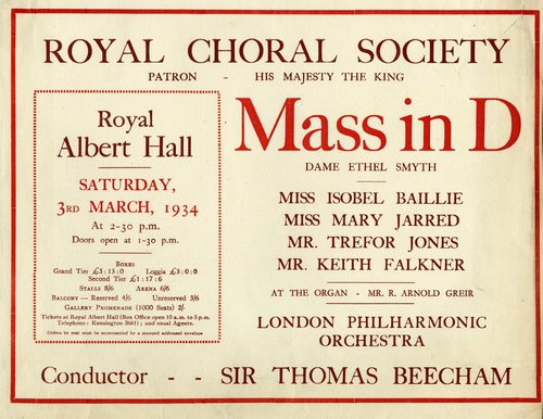 The costs of the concert had been subscribed by the composer's friends and admirers to celebrate her seventy-fifth birthday. Dame Ethel was sat in the Royal Box with the Queen. (The Daily Telegraph, 5 March 1934) |
