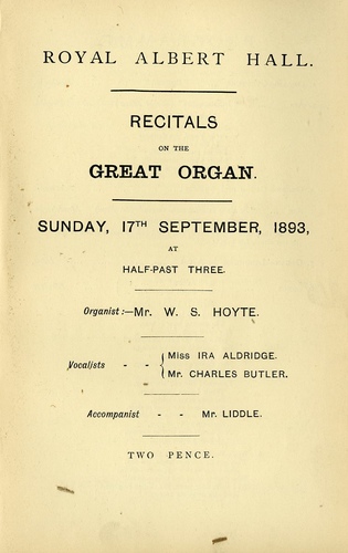 | Main Performers | Miss Ira Aldridge, Mr Charles Butler - vocals, W S Hoyte - organ |