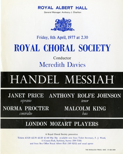 | Main Performers | Janet Price, Norma Procter, Anthony Rolfe Johnson, Malcolm King - vocals, John Alley - organ Leslie Pearson - harpsichord, Bernard Richards - cello, Nicholas Worters - double bass, Michael Laird - trumpet |