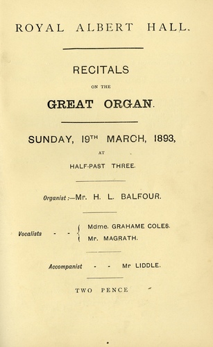| Main Performers | Mdme Grahame Coles, Charles MaGrath - vocals, H L Balfour - organ |