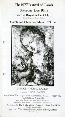 | Set List | 'O Come, All Ye Faithful', J F Wade, arr. Willcocks, 'Masters in This Hall', arr. Willcocks, 'Alleluia', Randall Thompson, 'O Little Town of Bethlehem', arr. Vaughan Williams, 'Ave Maria', Rachmaninoff, 'Midnight Carol', Kenneth Platts (Haberdashers' Aske's School,Elstree,Boys' Choir), 'Resonemus Laudibus', Anon. (Haberdashers' Aske's School,Elstree,Boys' Choir), 'Cowboy Carol', Cecil Broadhurst, arr. Sargent, Leon Lovett, 'Good King Wenceslas', arr. Reginald Jacques, 'Allegro' (Harp Concerto), Handel (Osian Ellis), 'The Glory of the Lord', arr. Osian Ellis (Osian Ellis), 'The Holly Tree', arr. Osian Ellis (Osian Ellis), 'Sonata Pian e Forte' (Sacrae symphonie), Gabrieli (English Brass Ensemble), 'Sans Day Carol', arr. Andrew Carter, 'Welcome the Christ Child', Bennett (Haberdashers' Aske's School, Elstree, Boys' Choir), 'Donkey Carol, Rutter', (Haberdashers' Aske's School, Elstree, Boys' Choir), 'Personent Hodie', (Haberdashers' Aske's School, Elstree, Boys' Choir), 'The Little Drummer Boy', Simeone, Onerati and Davis, arr .Leon Lovett, 'The First Nowell', arr. Willcocks INTERVAL 'Once in Royal David's City', H J Gauntlett, 'Christmas Dance of the Shepherds', Kodaly (Haberdashers' Aske's School, Elstree, Boys' Choir), 'New Year Carol, Britten' (Haberdashers' Aske's School, Elstree, Boys' Choir), 'Mary and Joseph, Ager' (Haberdashers' Aske's School, Elstree, Boys' Choir), 'O Magnum Mysterium', Gabrieli, 'Concert Piece for Harp', Marcel Tournier (Osian Ellis), 'Two Welsh Nursery Songs', arr. Osian Ellis (Osian Ellis), 'God Rest You Merry, Gentlemen', arr. Willcocks, 'Music for Christmas', Paul Hughes (English Brass Ensemble), 'Lullay, My Liking' (English Brass Ensemble), 'Christmas is Coming' (English Brass Ensemble), 'Unto Us is Born a Son', arr. Willcocks, 'Mary had a Baby', arr. Sargent, 'Sussex Carol', arr. Willcocks, 'Coventry Carol', 'As With Gladness Men of Old, Kocher', arr. Willcocks, 'Stille Nacht, Heilige Nacht, Franz Gruber', arr. Leon Lovett, 'We Wish You a Merry Christmas', arr. Arthur Warrell, 'Hark! The Herald Angels Sing', Mendelssohn, arr. Willcocks |