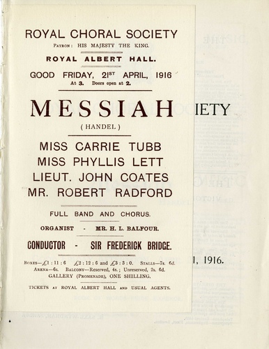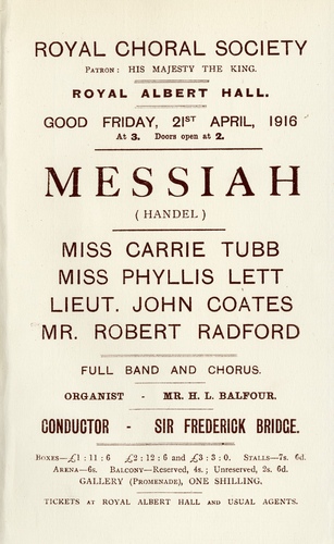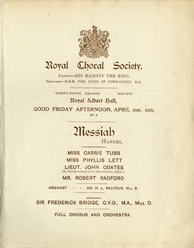 | Performance Notes | ""MESSIAH" AT THE ALBERT HALL Handel's Messiah was performed by the Royal Choral Society at the Albert Hall yesterday. There was a large audence, which included Mr Balfour and many wounded officers and men were present. Sir Frederick Bridge conducted, and the chief singers were Miss Carrie Tubb, Mrs Phyllis Lett, Lieutenant John Coates, and Mr Robert Radford. Mr H L Balfour played the organ, and Mr J Solomon gave the trumpet obbligato in "The Trumpet shall Sound." As usual the work was performed with Handel's accompaniments only." (The Times, 22 April 1916)