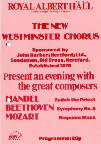 | Set List | 'Zadok the Priest', Handel (New Westminster Chorus, London Mozart Players), 'Symphony No.5 in C Minor, Op.67', Beethoven (London Mozart Players), 'Requiem Mass, K.626', Mozart (Jennifer Smith, Meriel Dickinson, James Griffett, Michael Rippon, New Westminster Chorus, London Mozart Players) |