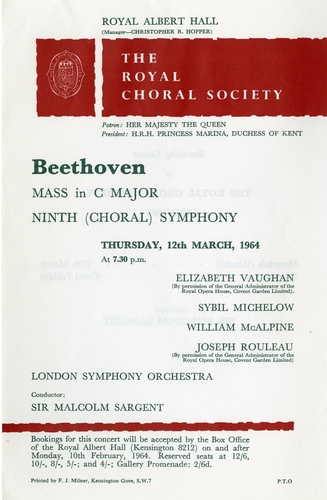| Set List | 'God Save the Queen' (The National Anthem), arr. Elgar, 'Mass in C', Beethoven (Elizabeth Vaughan, Sybil Michelow, William McAlpine, Joseph Rouleau, Royal Choral Society, London Symphony Orchestra), 'Symphony No.9 in D Minor' (Choral), Beethoven (Elizabeth Vaughan, Sybil Michelow, William McAlpine, Joseph Rouleau, Royal Choral Society, London Symphony Orchestra) |